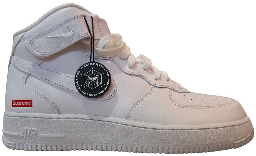 This iconic collaboration between Nike and Supreme blends the timeless elegance of the classic white Air Force 1 with Supreme’s subtle urban touch, featuring the signature red box logo on the heel.\u000a\u000aCondition: Brand new, never worn, with original box\u000a\u000aColor: Pure White\u000a\u000aSize: 45 EU / 11 US\u000a\u000aDetails: premium leather, legendary comfort, flawless finish